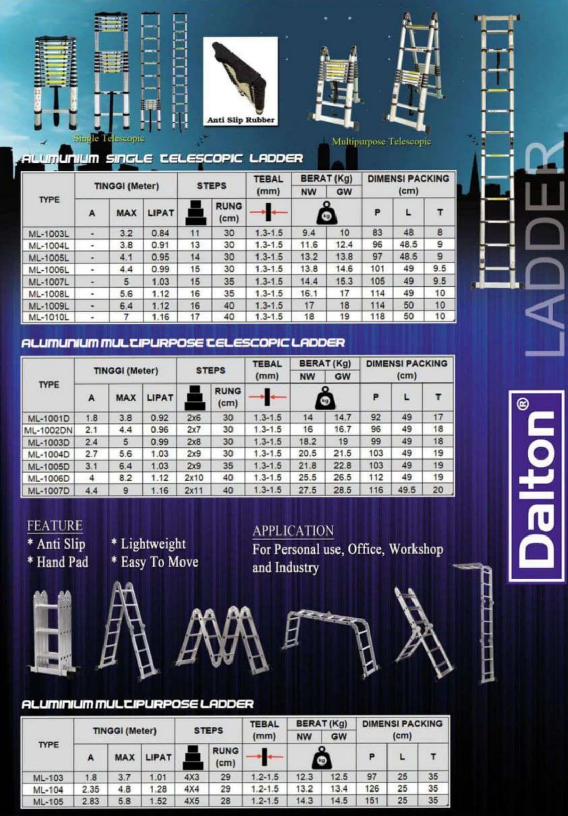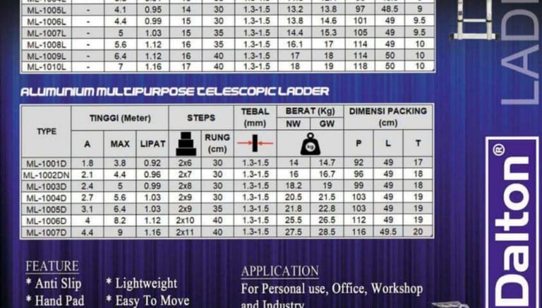 Tangga Dalton Multipurpose adalah solusi serbaguna yang hemat biaya dan ruang. Dengan fleksibilitas hingga $5,8 \text{ m}$, tangga ini sangat dicari oleh kontraktor di Tangerang dan Surabaya yang menangani proyek kompleks, serta untuk kebutuhan pemeliharaan di perumahan atau toko di Semarang dan Bandung.