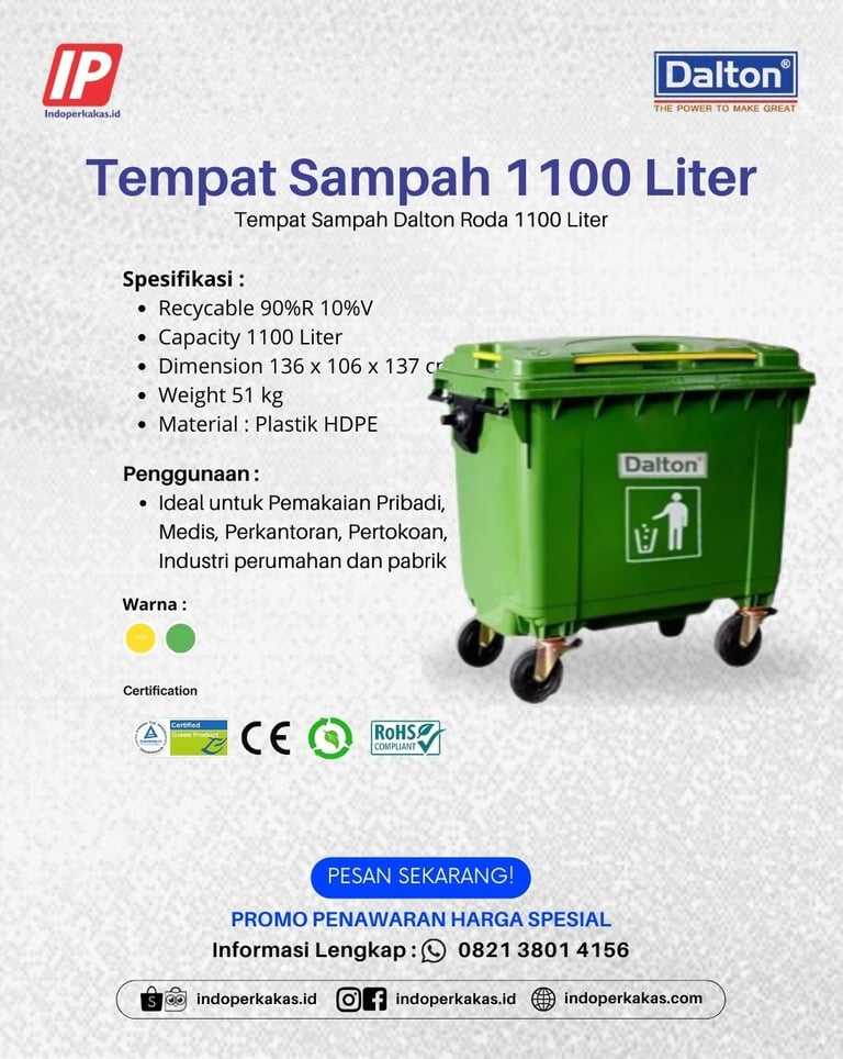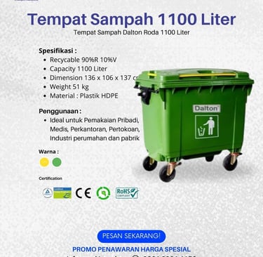 - Kapasitas Besar, Mampu menampung hingga 1100 liter sampah, cocok untuk area dengan volume sampah tinggi seperti perumahan, perkantoran, dan industri.